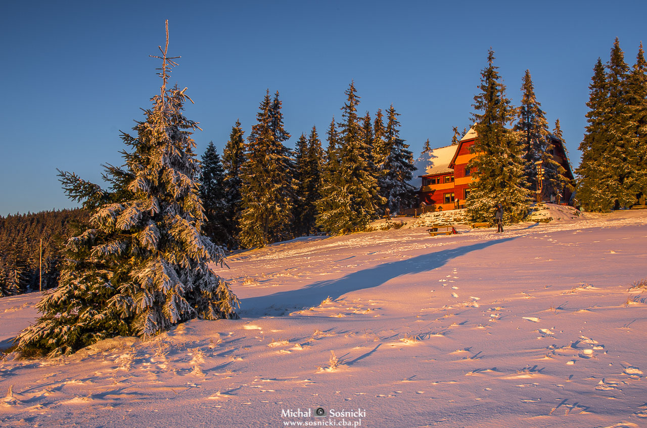 Statywy rozkładamy 10 metrów od schroniska. Jest zimno, minus „ileś” ale przez zimny wiatr, odczuwalna temperatura jest sporo niższa… Mam dwie pary rękawiczek (polarowe + narciarskie) ale te narciarskie muszę ściągać co chwilę gdyż nie da się w nich nic zrobić z aparatem (no może poza spakowaniem go do plecaka…). Dawno nie zmarzły mi tak ręce… Chyba czas pomyśleć o ogrzewaczach. Półtorej godziny w tych warunkach fotografujemy a potem idziemy na zasłużone śniadanko do schroniska 🙂