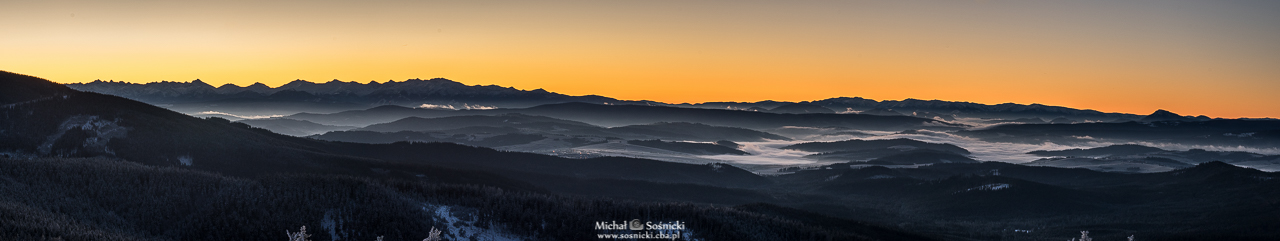 | Panorama z Rysianki: Tatry, Niżne Tatry aż po Wielki Chocz. |
