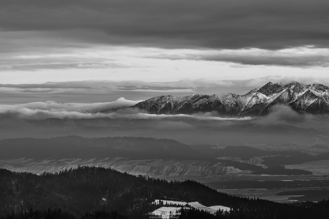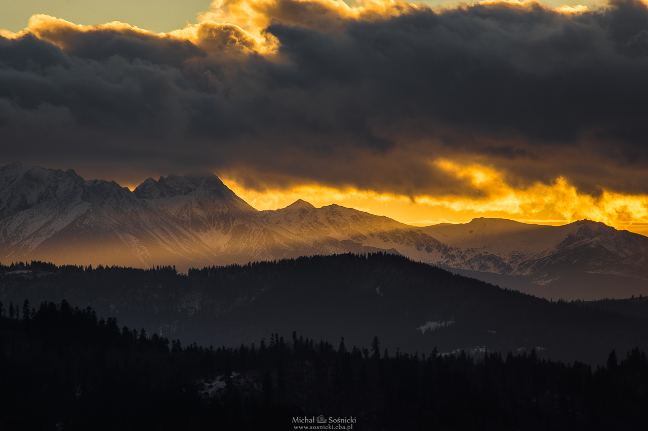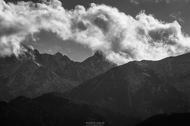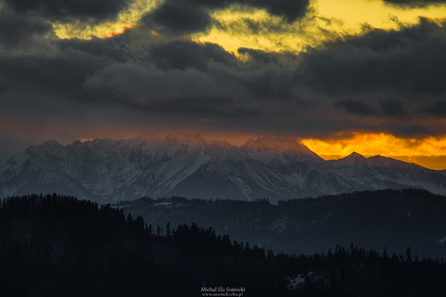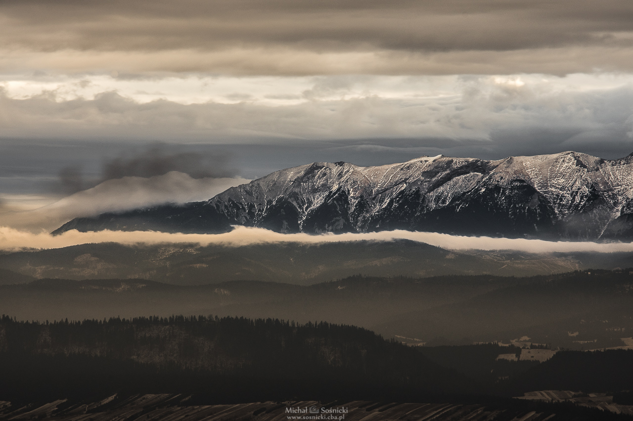 Jadąc na plener w Pieniny, muszę „zahaczyć” jeszcze o Zakopane. Prognozy nie są najlepsze ale słońce zaczyna przebijać się przez chmury i nad Tatrami zaczynają dziać się cuda… Zatrzymuję się na Głodówce w Bukowinie i podziwiam spektakl nad górami, mimo iż pora do zdjęć jest… taka sobie. Samo południe. Ale ponieważ nie jest to lato a zima, to kontrasty nie są tak duże i spokojnie można wykonywać zdjęcia 🙂