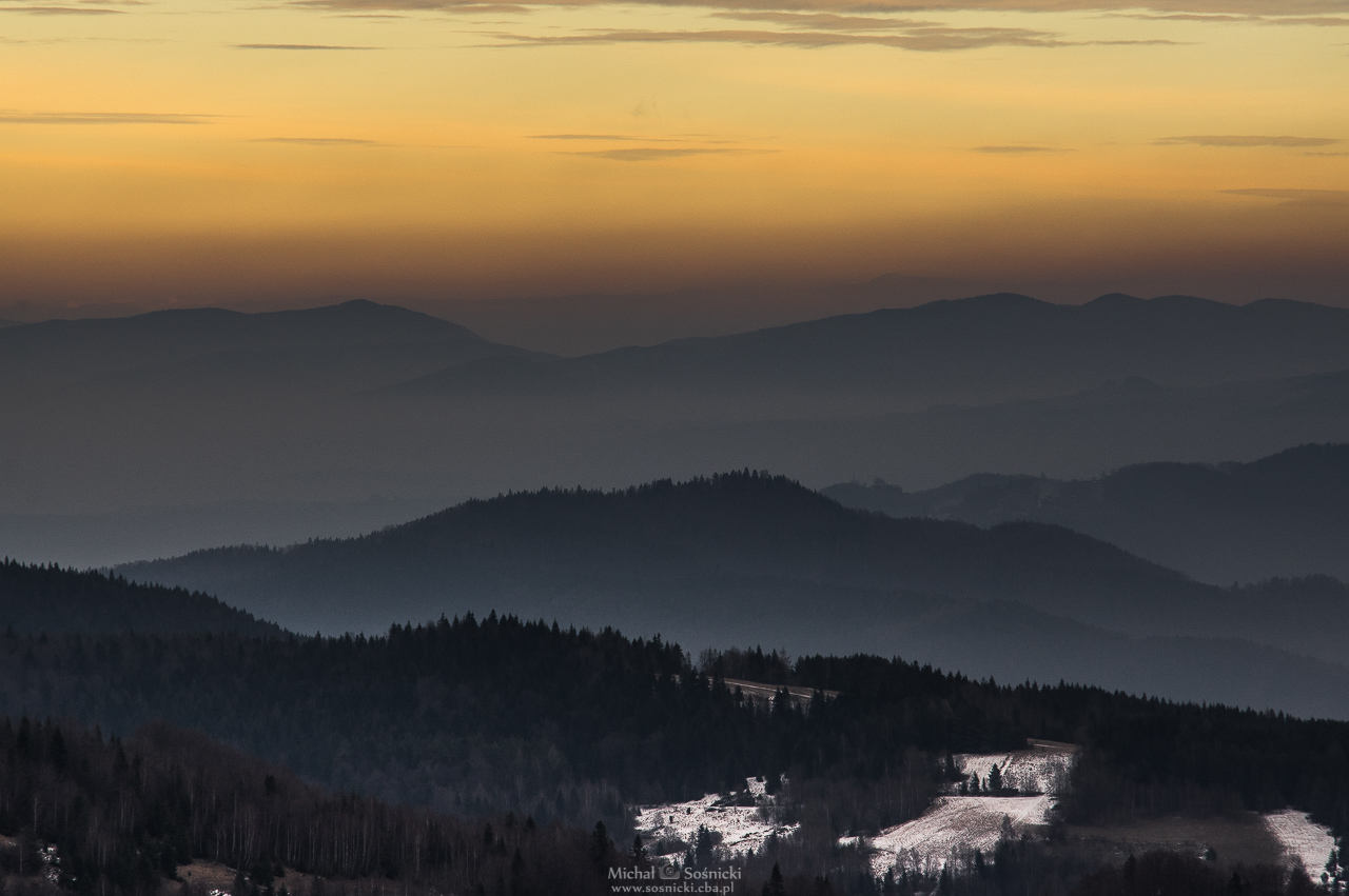Po śniadaniu robię chwilę przerwy i o 11 – tej ruszamy na Lubań, w Gorce… Tak przynajmniej było w planie ale… Decyduję się na zmianę miejscówki… Jedziemy do Ochotnicy gdzie zostawiamy samochody na os. Jaszcze i ruszamy ścieżką przyrodniczą na wieżę widokową na Magurki… Choć pogoda się psuje to jednak, aż trudno uwierzyć w to że Tatry są nadal widoczne tak wyraźnie… Przejrzystość między smogiem a chmurami jest „żyleta”! Czekamy na zachód słońca i choć go nie widzimy, to i tak jest pięknie… A dodatkowo, w momencie kiedy decydujemy że koniec, chmury… zakrywają w 100% Tatry!!! Coś niesamowitego że wytrzymało dokładnie tyle czasu ile potrzebowaliśmy 🙂